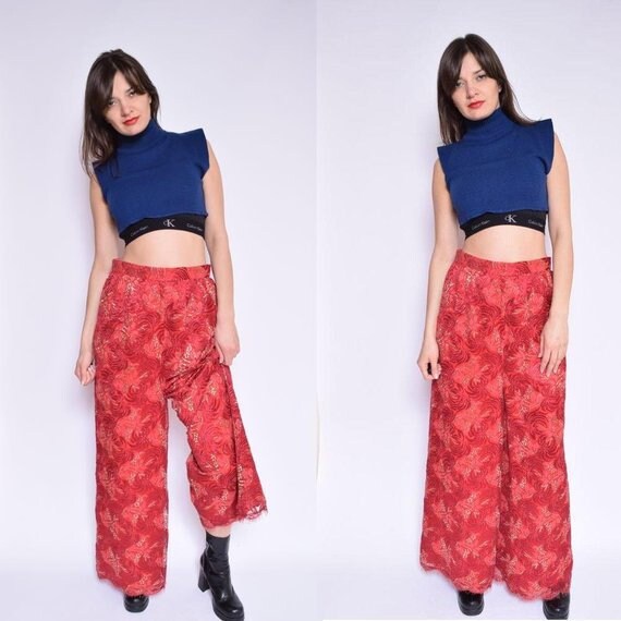 Palazzo Pants Vintage 90 S Red Lace Wide Leg Red Pants High Waisted Bell Bottom Trousers Size Large